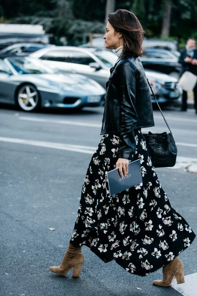 Specifically highlighting floral maxi dresses, these fall florals are particularly black based which brings an edge to it. With this, the bold, rich colors of the flowers are able to pop. I love seeing this look paired with a classic moto jacket. You can layer a sheer underlay bodysuit with some of the dresses that are strapless or spaghetti strap. Be daring by wearing a high slit floral maxi with some over-the-knee boots.