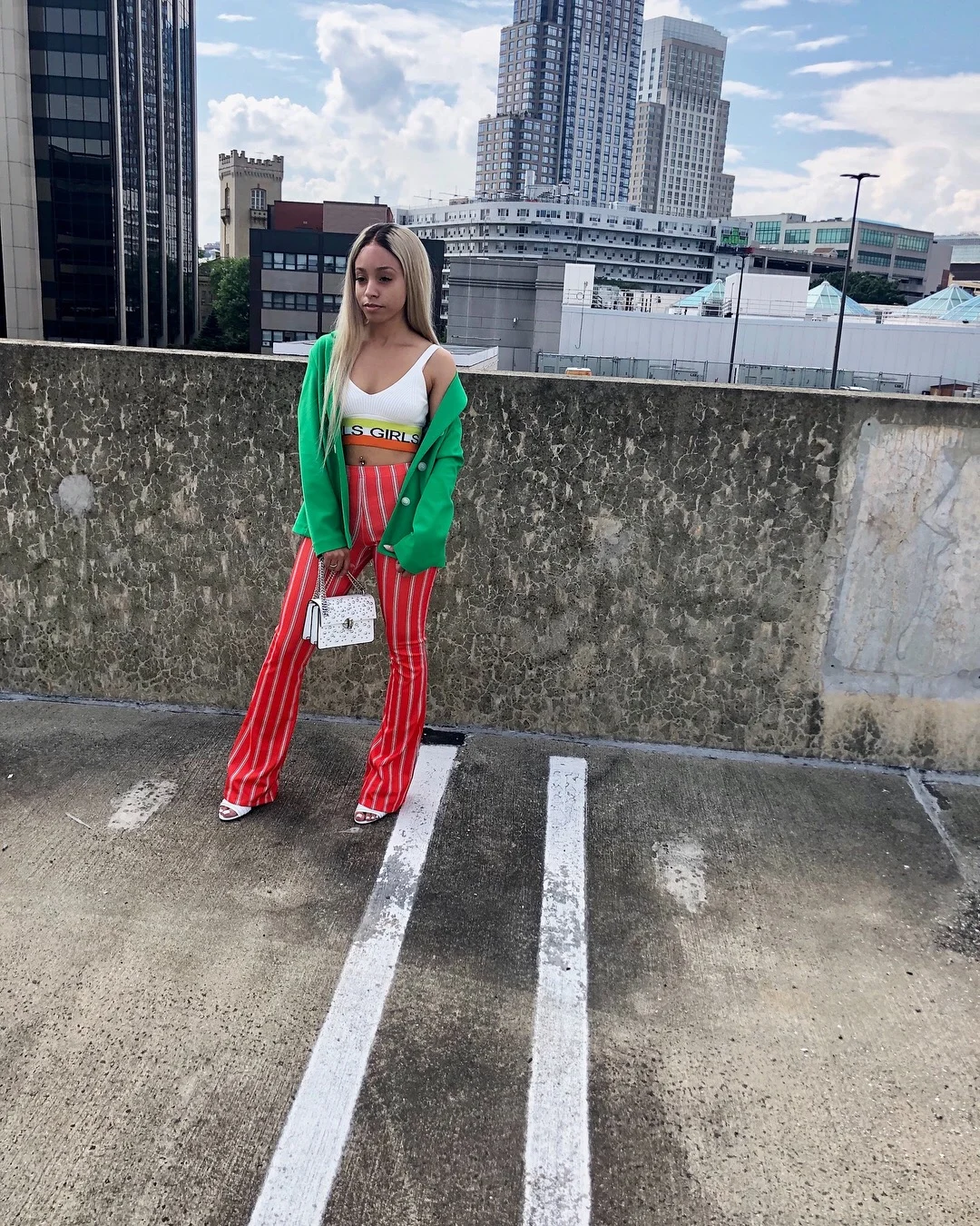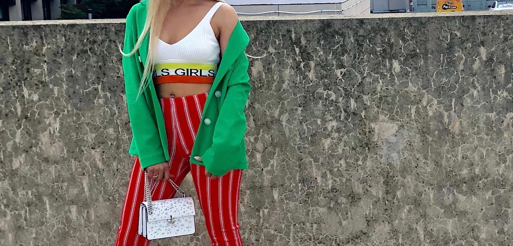 If you want to be subtle, you can introduce colors at a smaller scale. Focus on one color then add your second color as an accessory. For example, you could wear a pink blazer and pair it with some clean denim or pants. Then add your secondary color in your bag or maybe a statement necklace that way you are still showcasing the colors together. Wear a white t-shirt (graphic or plain) and some barely there shoes.